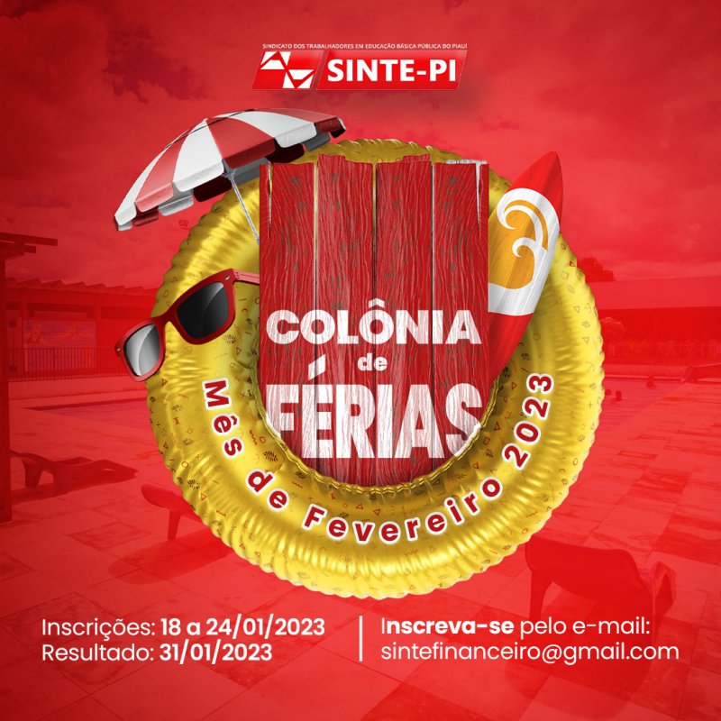 As inscrições para hospedagem na Colônia de Férias do Sinte PI para o mês de fevereiro/2023 estão abertas de 18 a 24 de janeiro e podem ser realizadas SOMENTE pelo sócio titular, presencialmente (em horário comercial) ou pelo e-mail: sintefincanceiro@gmail.com. Não serão aceitas inscrições pelo whatsapp.
