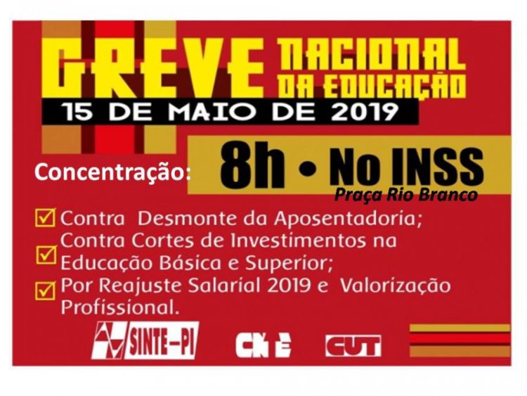 Em Teresina, o SINTE-PI irá reunir todos os trabalhadores em educação, com participação dos 27 Núcleos Regionais do Estado para fortalecer esta grande mobilização em defesa dos direitos dos trabalhadores e respeito à educação. Além do Sinte-PI o movimento contará com docentes da Universidade Federaç do Piauí, Universidade Estadual do Piauí e Instituto Federal do Piauí, sindicatos de servidores estaduais e municipais, estudantes e toda comunidade escolar.