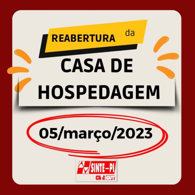 No próximo domingo (5) o SINTE-PI reabrirá a Casa de Hospedagem, localizada na Rua Benjamin Constant, 1270, Centro/Norte, Teresina, para o atendimento aos filiados e seus dependentes (quando necessário para o tratamento de doenças). As reservas para o mês de março podem ser feitas no período entre os dias 28/2 (terça-feira) a 4/3 (sábado), no horário comercial (de 8h às12h / 14h às 17h), pelo telefone: (86) 999170042.