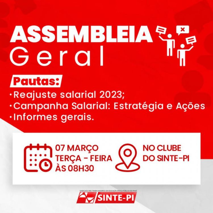 Na próxima terça-feira (7) o SINTE-PI promove, a partir das 8h30, em sua sede social, uma Assembleia Geral dos Trabalhadores e Trabalhadoras da rede estadual de educação pautada na luta pelo reajuste salarial e valorização profissional. Nossa defesa é, e sempre será pelo reajuste linear e na carreira, portanto, indo de encontro ao achatamento da carreira delineado no PL13/23 enviado a ALEPI pelo governo Rafael Fonteles.