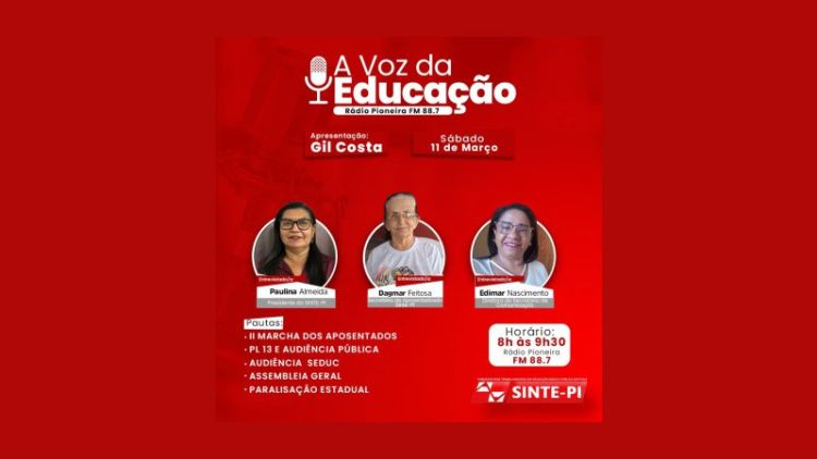 Das 8h às 9h30 pela rádio Pioneira FM 88,7 radiopioneirathe.com ou ainda pela rádioweb do Sinte no endereço avozdaeducacao.com