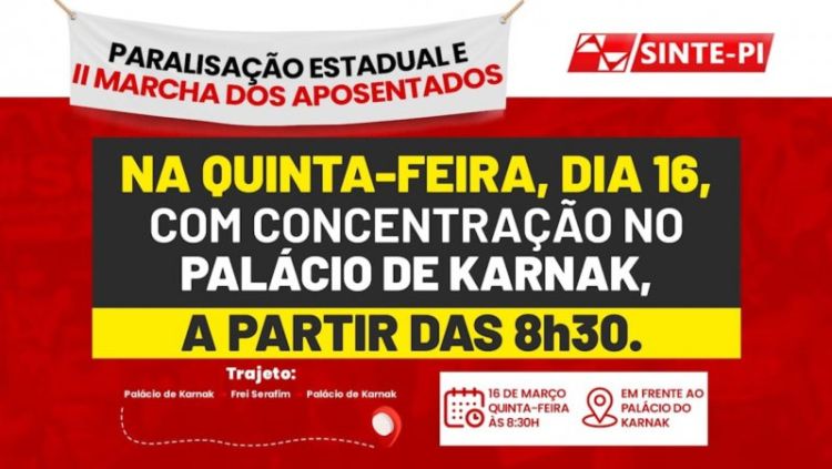 O SINTE-PI convoca todos os trabalhadores da rede estadual de educação, ativos e aposentados, para a II MARCHA DE APOSENTADOS com PARALISAÇÃO ESTADUAL.