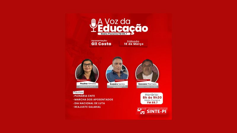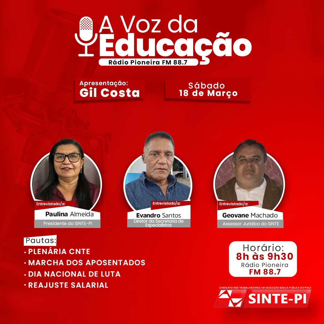 Das 8h às 9h30 pela rádio Pioneira FM 88,7 radiopioneirathe.com ou ainda pela rádioweb do Sinte no endereço avozdaeducacao.com