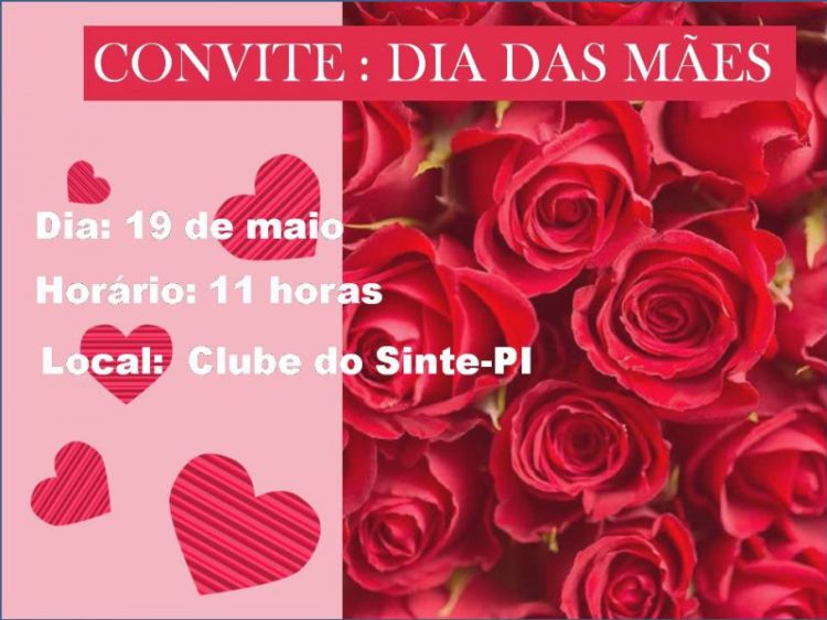 O Sindicato dos Trabalhadores em Educação Básica do Piauí (SINTE-PI) convida todas as trabalhadoras da educação para a tradicional atividade de celebração do dia das Mães, que acontece neste domingo (19), no Clube da categoria.