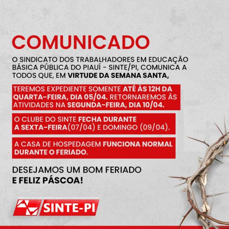 Informamos aos trabalhadores e trabalhadoras em educação sobre o funcionamento dos espaços do SINTE-PI nesta Semana Santa.