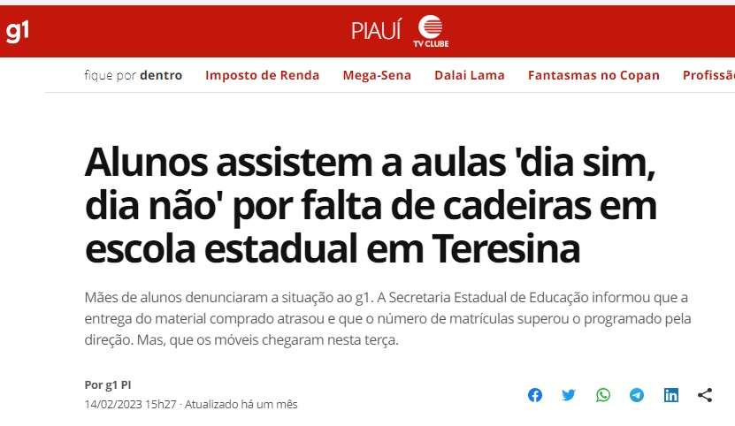 Escolas com reformas inacabadas há anos, sendo que a maioria o prazo de conclusão é de 180 dias porém não colocam o início da obra na placa para que a população não fiscalize; escolas sem banheiros adequados, quadra de esporte, sem cadeiras escolares suficientes para os estudantes ou cadeiras quebradas; falta de refeitórios, algumas até os estudantes recebem a merenda, que não acompanha o cardápio nutricional indicado na escola segundo a fiscalização da auditoria do Tribunal de Contas do Estado (TCE-PI); paredes rachadas, goteiras nas salas de aula e ainda falta de estrutura para os professores e funcionários também de tempo integral. Essas são algumas das denúncias que se pode constatar indo nas escolas da rede estadual do Piauí.