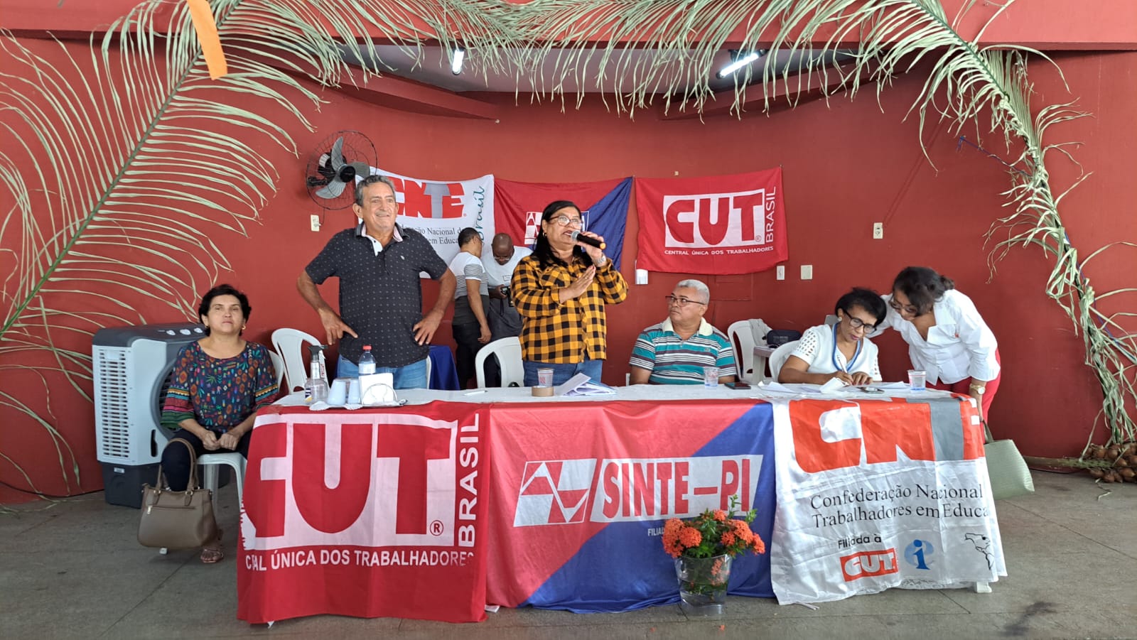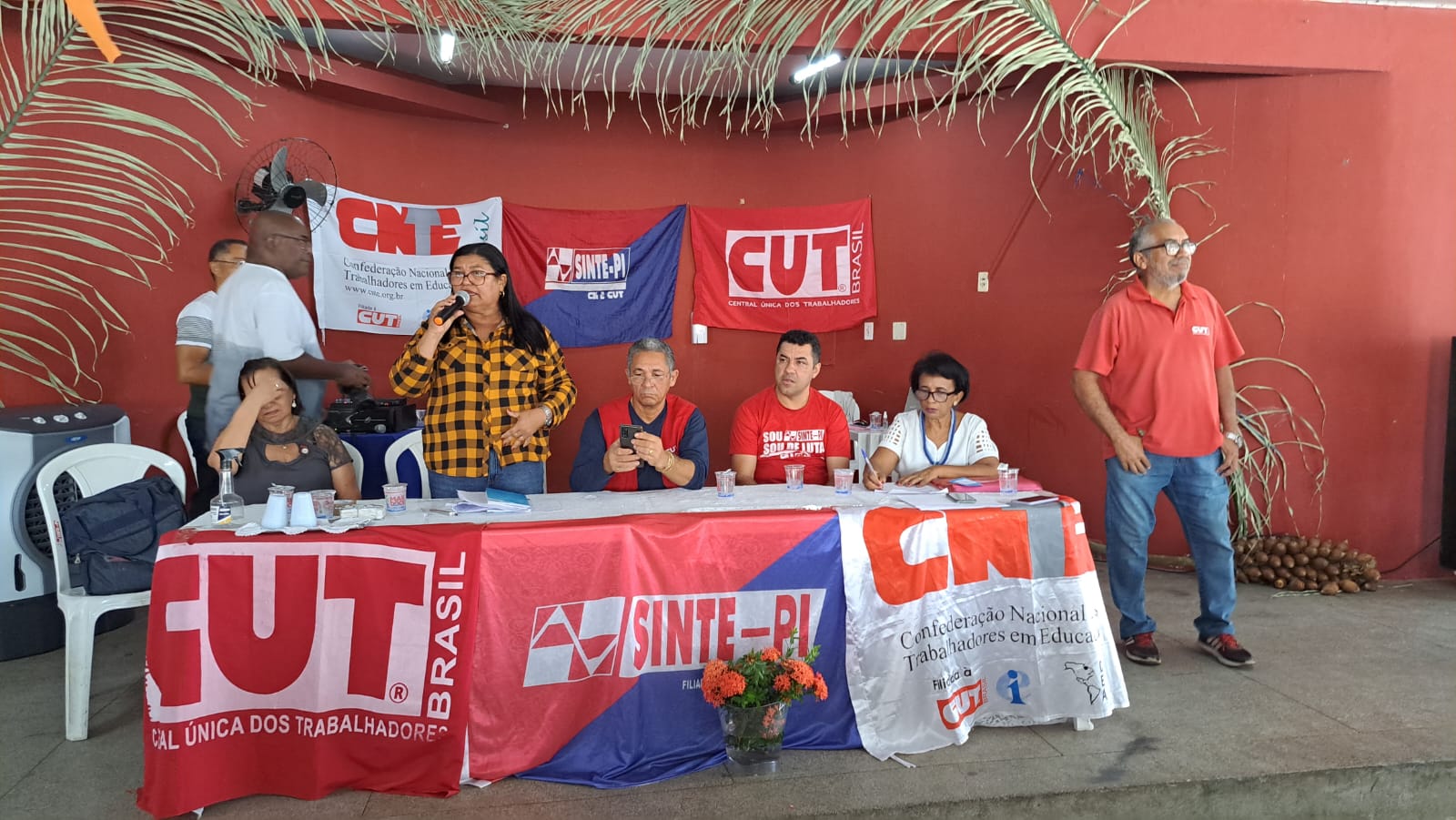 A mesa para eleição dos delegados para o CECUT foi composta por Paulina Almeida (presidente Sinte-PI), Paulo Bezerra (presidente CUT-PI), Filomena Ferreira (secretarária geral), Léa Almeida (presidente Sinte-Floriano) e Junior Timóteo (presidente Sinte-Canto do Buriti). Após as discussões, foram apresentadas duas chapas, sendo impugnada a chapa 2 apresentada pela professora Lourdes Melo, por não atender ao regimento da CUT Nacional, onde toda chapa deverá ter o mínimo de 20% do total das vagas disponíveis para a entidade. A chapa 2, da professora Lourdes Melo, constava apenas 4 (quatro) nomes inscritos pleiteando a vaga de delegados. A Chapa 1 - Resistência foi aprovada por ampla maioria, tendo apenas 3 (três) votos de abstenção.