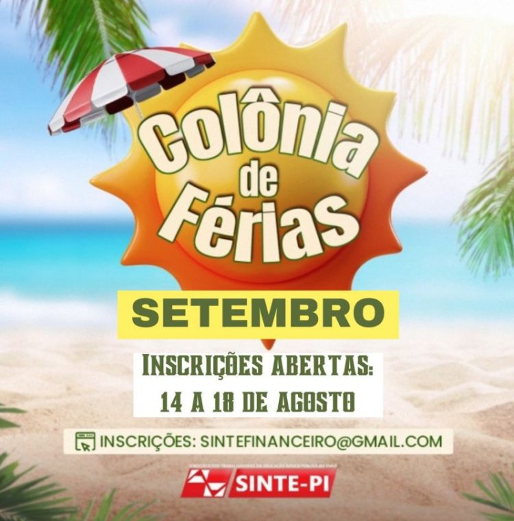 Estão abertas, do dia 14 até o dia 18 de agosto, as inscrições para os filiados e filiadas que queiram fazer reserva a Colônia de Férias do SINTE-PI . O resultado do sorteio será divulgado no dia 25 de agosto de 2023, no site do sindicato (www.sintepiaui.org.br). Somente a/o titular está apta/o para fazer a inscrição, que deverá ser encaminhada para o e-mail: sintefinanceiro@gmail.com No ato da inscrição o/a titular deverá informar seu nome completo, período pretendido, telefone de contato, cidade e número de matrícula do titular. A reserva somente será considerada será anexando no e-mail o contracheque e RG ou Carteira do SINTE-PI, ou apresentando estes documentos no escritório do SINTE-PI. NÃO SERÃO ACEITAS INSCRIÇÕES POR WHATTSAP.