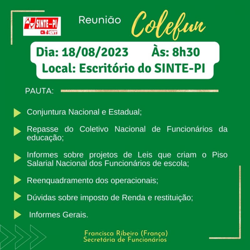 Na sexta-feira dia 18 de agosto acontecerá mais uma reunião do Coletivo de Funcionários (Colefun), a partir das 8h30 no escritório do Sinte-PI.