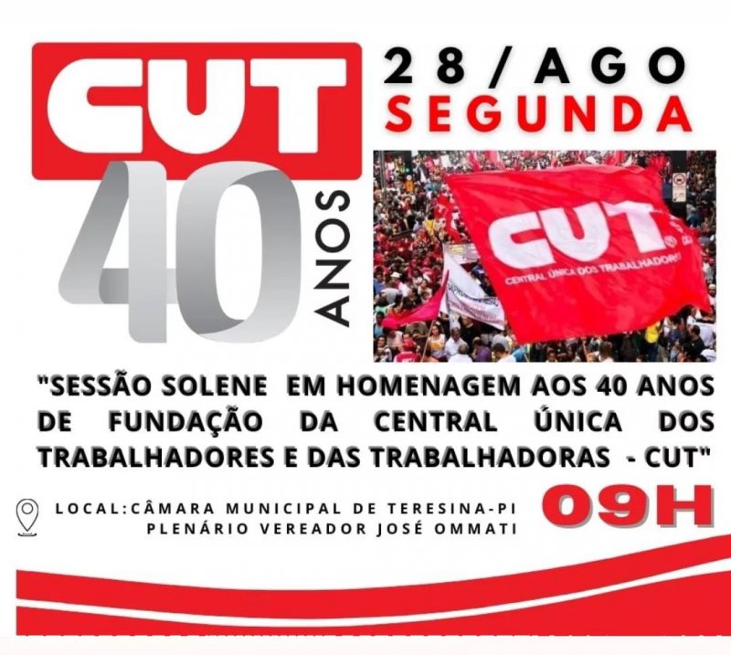 A Central Única dos Trabalhadores completa 40 anos de fundação, luta e resistência em defesa dos direitos da classe trabalhaora. E será homenageada em sessão solene no próximo dia 28 de agosto de 2023, às 9h na Câmara Municipal de Teresina.