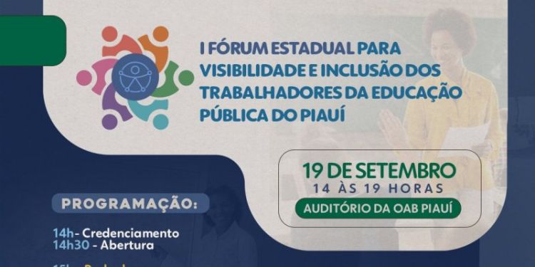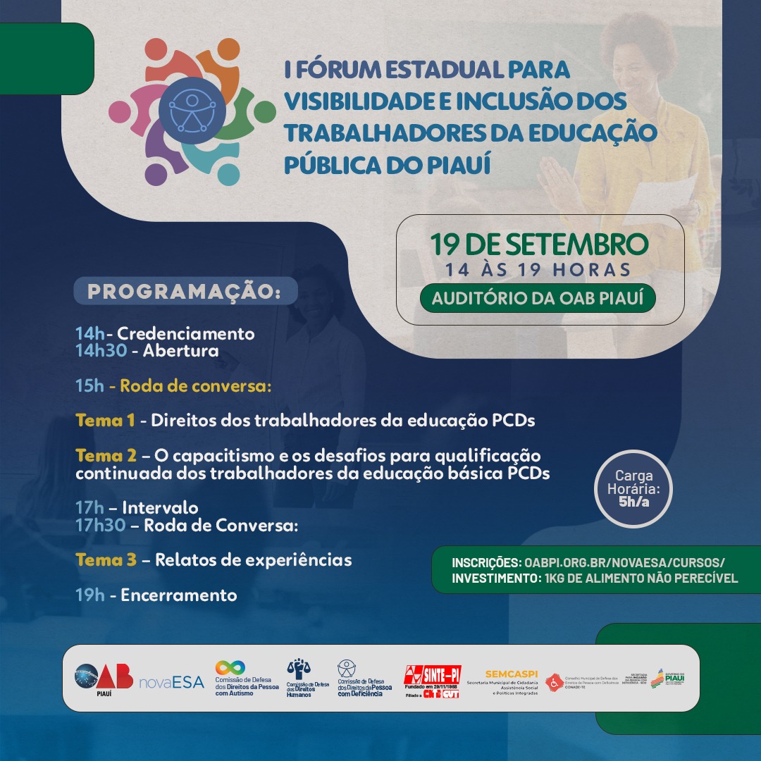 O Fórum é destinado para todos os públicos, com prioridade aos servidores da educação com alguma deficiência. O evento acontecerá dia 19 de setembro no horário das 14h às 19 horas, no auditório da OAB-PI. Para participar os/as interessados/as o investimento será a doação de 1 kg de alimento não perecível e devem fazer inscrição através do link a seguir: