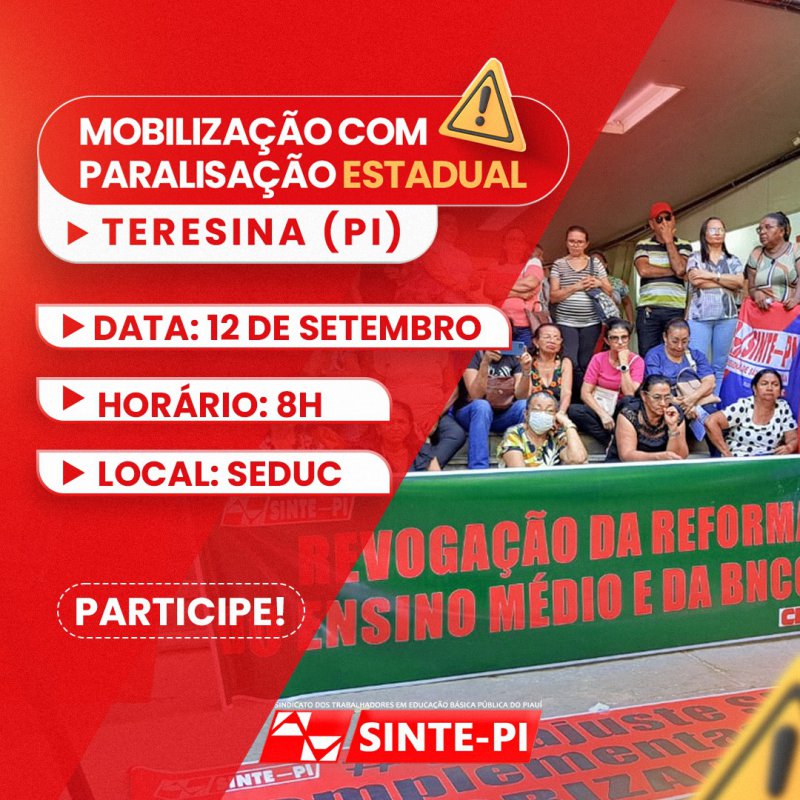 O SINTE-PI reforça a convocação aos trabalhadores e as trabalhadoras da rede estadual de educação para que paralisem suas atividades e participem da manifestação pública que será realizada na manhã de terça-feira (12), a partir das 8h, no pátio da Secretaria de Educação do Piauí (Seduc-PI). A manifestação integra a agenda de lutas da categoria em defesa do reajuste salarial linear e na carreira e da valorização profissional.
