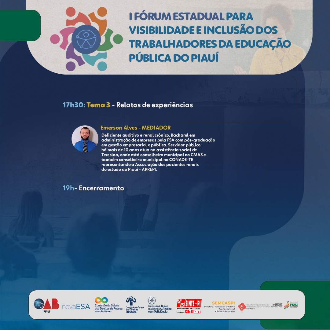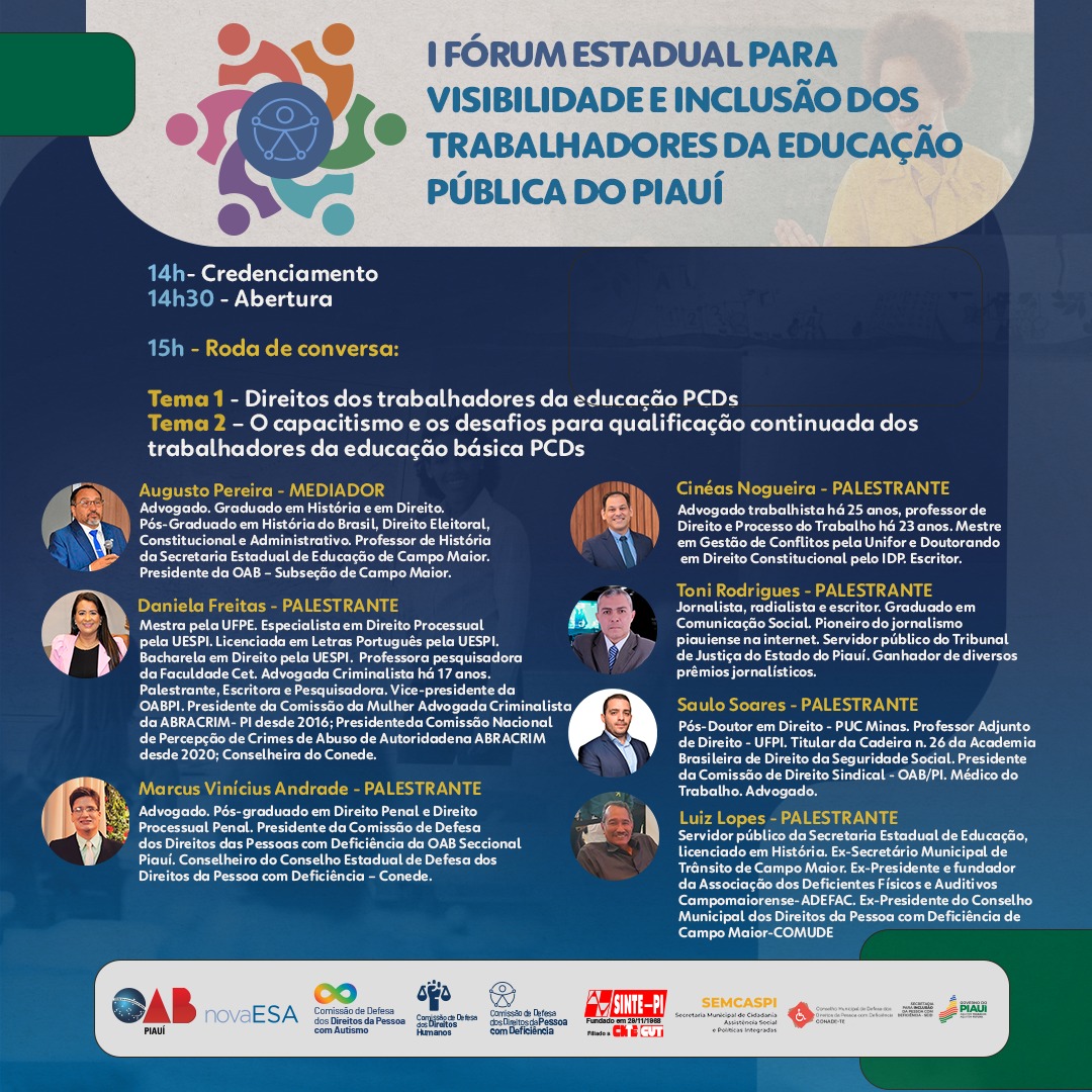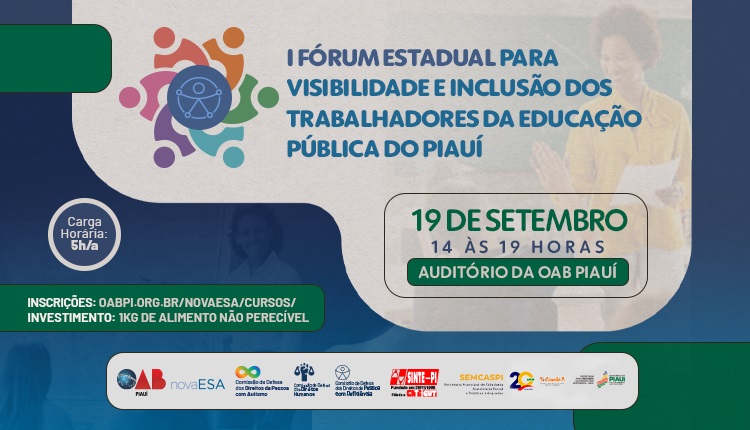 O Fórum é destinado para todos os públicos, com prioridade aos servidores da educação com alguma deficiência. O evento acontecerá dia 19 de setembro no horário das 14h às 19 horas, no auditório da OAB-PI. Para participar os/as interessados/as o investimento será a doação de 1 kg de alimento não perecível e devem fazer inscrição através do link a seguir:
