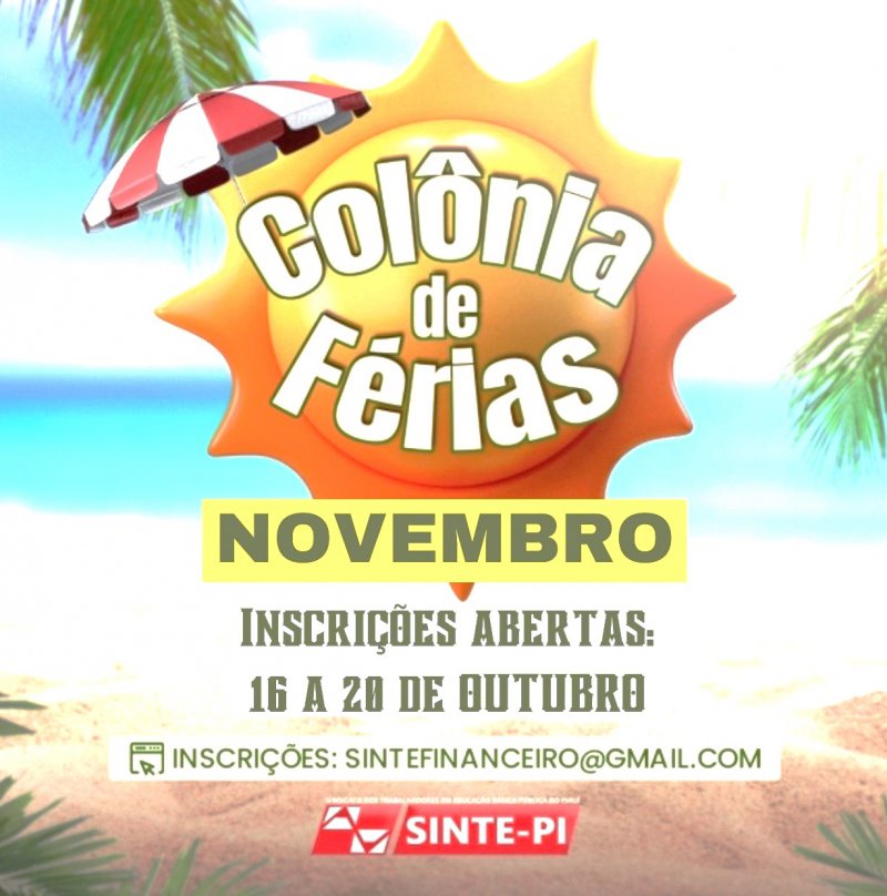 Estão abertas, do dia 16 até o dia 20 de outubro, as inscrições para os filiados e filiadas que queiram fazer reserva a Colônia de Férias do SINTE-PI . O resultado do sorteio será divulgado no dia 27 de outubro de 2023, no site do sindicato (www.sintepiaui.org.br). Somente a/o titular está apta/o para fazer a inscrição, que deverá ser encaminhada para o e-mail: sintefinanceiro@gmail.com