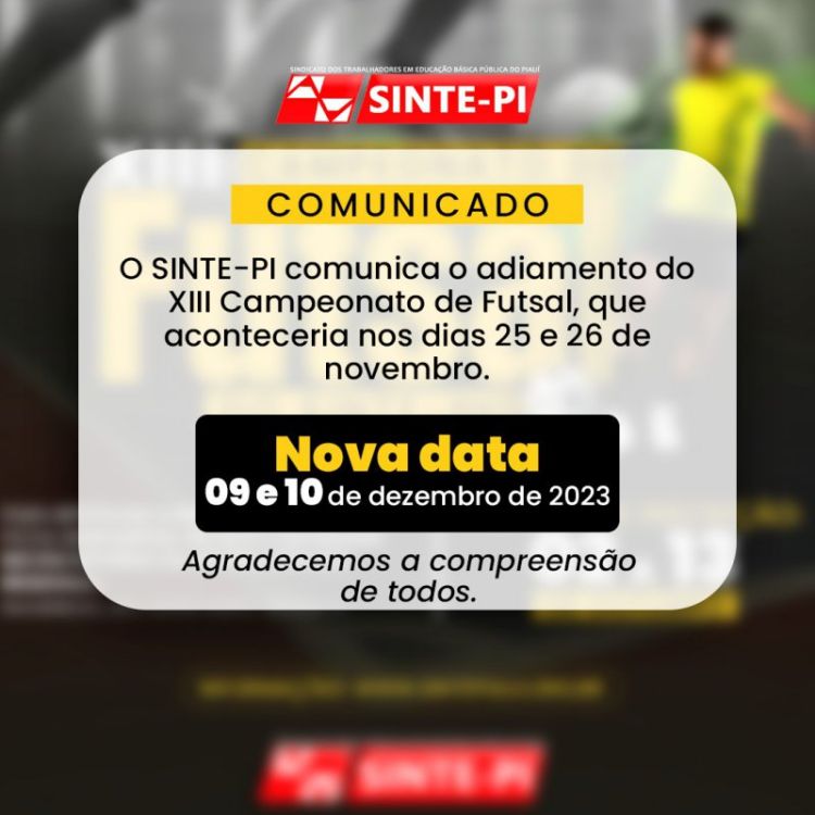 A Secretaria de Esportes do Sinte-PI vem comunicar aos seus filiados que o 13º Campeonato de Futsal Masculino, que aconteceria nos dias 25 e 26 de novembro foi adiado para os dias 09 e 10 de dezembro de 2023.