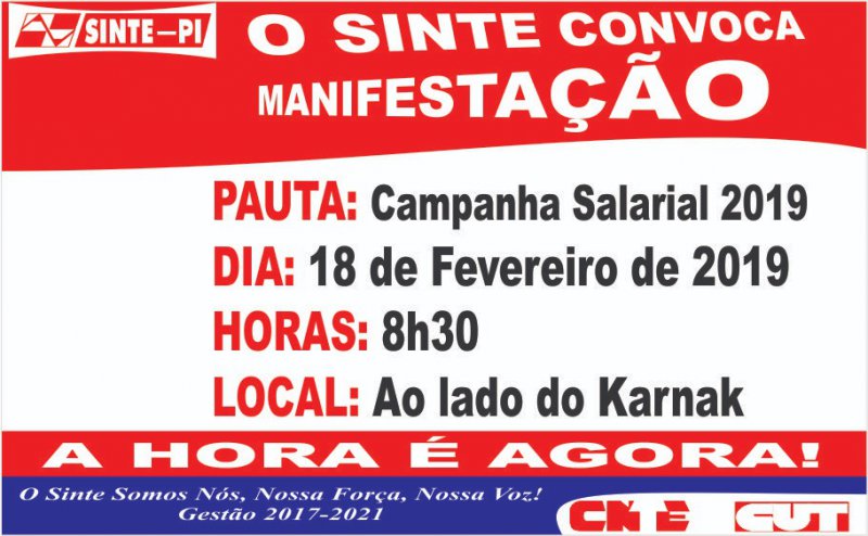 O Sindicato dos Trabalhadores em Educação convoca toda a categoria para se fazer presente na manifestação em prol do reajuste salarial de 4,17% para docentes e funcionários de escola. O ato acontece nesta segunda-feira (18) ao lado do Palácio do Karnak, a atividade foi uma das deliberações retiradas pelos associados na última assembleia realizada no dia (05) no Clube Social do SINTE-PI.