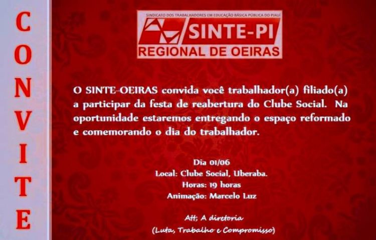 O Núcleo Regional de Oeiras do Sinte-PI, com muito prazer, convida os/as filiados/as a participar, no próximo sábado (1º), a partir das 19h, da festa de reabertura (com um show do talentoso e carismático cantor Marcelo Luz) do Clube Social da entidade, totalmente reformado para proporcionar o maior conforto possível para a nossa categoria.