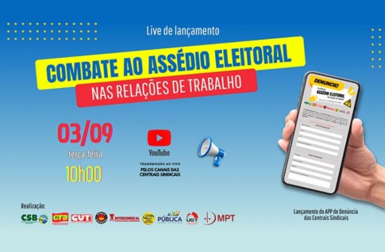 As centrais sindicais CUT, Força Sindical, NCST, UGT, CTB, CSB, Pública e Intersindical irão lançar o canal de denúncias de assédio eleitoral nas eleições municipais de 2024. O lançamento ocorrerá em uma transmissão ao vivo no canal do YouTube da CUT, nesta terça-feira (3), às 10 horas.