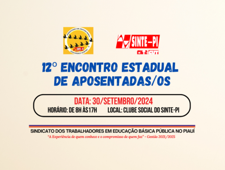O Sinte-PI está preparando a décima segunda edição do Encontro Estadual de Aposentadas e Aposentados da educação básica. O Encontro acontecerá dia 30 de setembro de 2024, das 8h às 17h, no Clube Social do Sinte-PI.