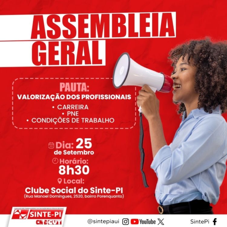 SINTE-PI convoca a categoria para participar da Assembleia Geral que será realizada nesta quarta-feira, dia 25 de setembro, a partir das 8h30, no Clube Social do sindicato, tendo como pauta a valorização profissional dos trabalhadores e trabalhadoras em educação, o novo Plano Nacional de Educação e condições decentes de trabalho.