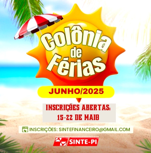 Estão abertas as inscrições para a Colônia de Férias do SINTE-PI para o mês de JUNHO/2025. As inscrições devem ser realizadas do dia 15/5/2025 ao dia 22/05/2025, nos períodos de 8h às 11h40 e de 14h às 17h30 (de segunda-feira a sexta-feira). Caso a quantidade de inscrições supere o número de vagas disponíveis, será realizado um sorteio no dia 29 de maio de 2025 a partir das 15h.