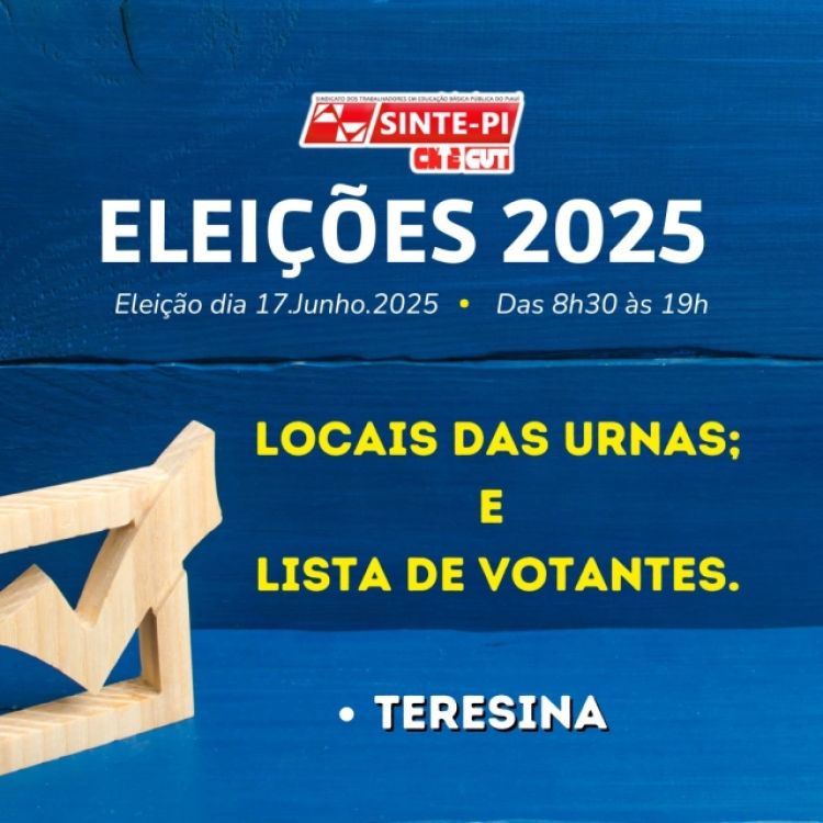 A Comissão Eleitoral Estadual divulga a lista oficial com os locais de votação (urnas) e os nomes dos filiados/as aptos/as para votar nas eleições do SINTE-PI que ocorrerão no dia 17 de junho de 2025, em Teresina e nos Núcleos Regionais, das 8h30 às 19h.