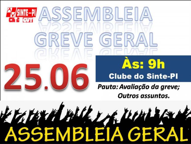 O Sindicato dos Trabalhadores em Educação da Básica do Estado Piauí (SINTE-PI) convoca todos os trabalhadores em educação para uma Assmebleia Geral Extraordinária que acontecerá dia 25 de junho, a partir das 9h no clube Social da categoria. Na pauta será discutida a avaliação do movimento grevista e outros assuntos de interesse da categoria.
