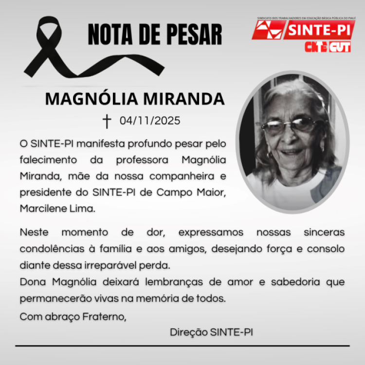 O SINTE-PI manifesta profundo pesar pelo falecimento da professora Magnólia Miranda, mãe da nossa companheira de luta e presidente do SINTE-PI de Campo Maior, Marcilene Lima, ocorrido no início da tarde desta terça-feira (04/11/2025).