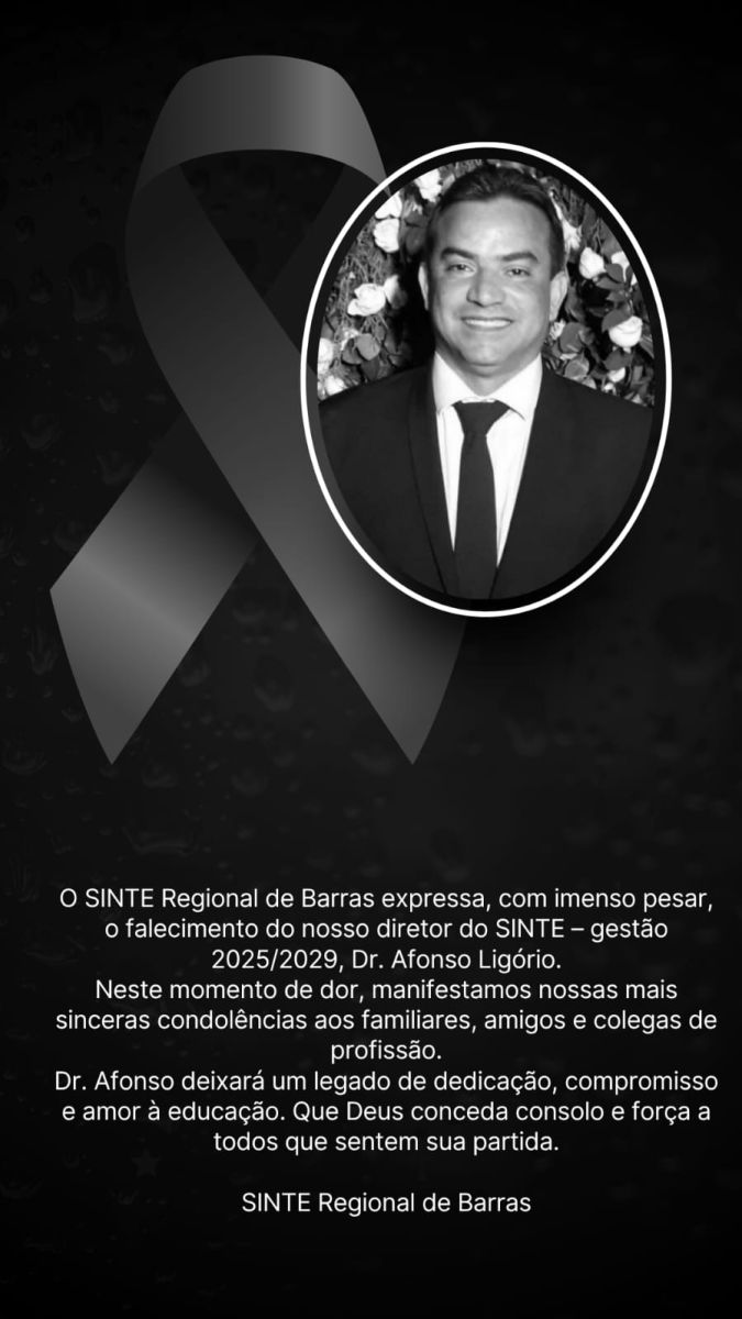 O Sinte-PI recebe com profundo pesar a nptícia do falecimento do diretor do Sinte Núcleo Regional de Barras, Afonso Ligório, ocorrido na última sexta-feira dia 14 de novembro.