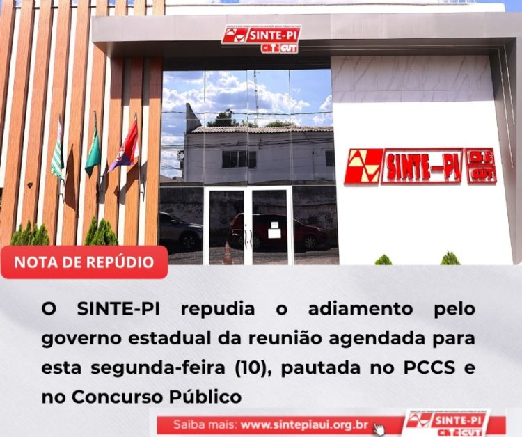 O Sindicato dos Trabalhadores em Educação Básica Pública do Piauí, SINTE-PI, expressa publicamente seu contundente repúdio ao inadmissível adiamento da reunião que estava agendada para esta segunda-feira, 10 de novembro, com os secretários de Educação (SEDUC), Administração (SEAD), Planejamento (SEPLAN), Fazenda (SEFAZ) e Relações Sociais (SERES) do Governo Rafael Fonteles. A pauta era clara, urgente e inadiável: a construção do novo Plano de Carreira do Magistério e do Concurso Público. Este adiamento é mais do que um descaso administrativo, é um sinal inequívoco de que a educação pública e seus profissionais não são prioridade para este governo.