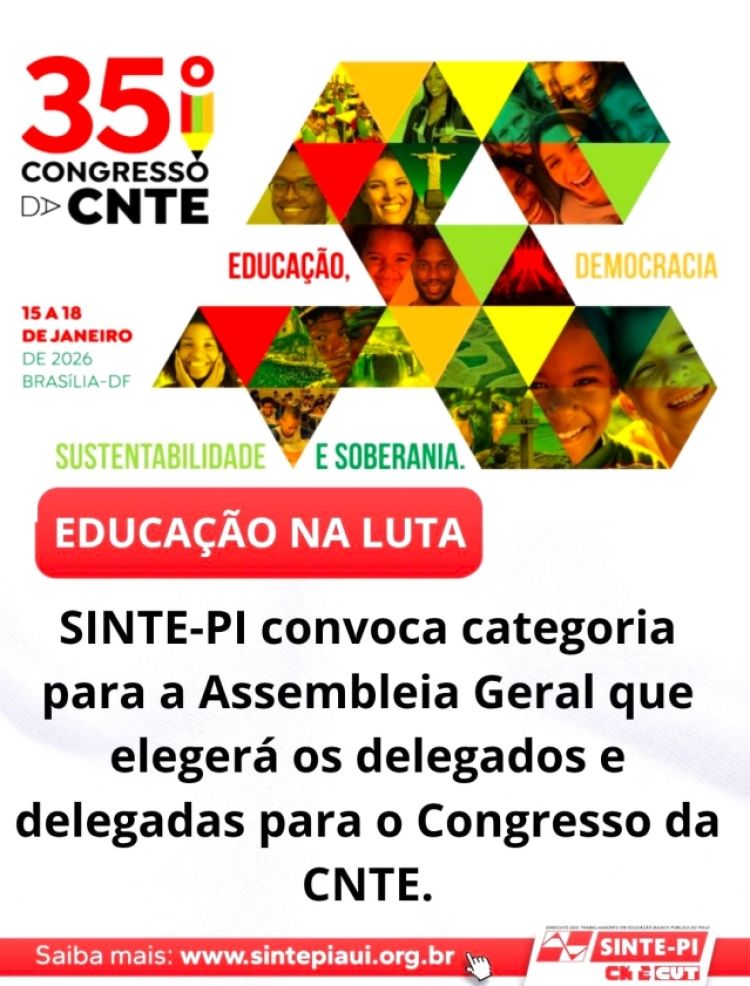 O SINTE-PI convoca os/as trabalhadores/as filiados/as ao sindicato para participar, na próxima quarta-feira (19), a partir das 8h30, no Clube do SINTE, da Assembleia Geral pautada no processo de eleição de delegados/as que irão compor a delegação do Piauí no 35º Congresso Nacional da CNTE, que acontecerá em janeiro de 2026, em Brasília.