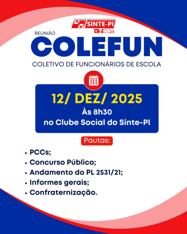 O SINTE-PI realiza no dia 12 de dezembro, às 8h30, no Clube Social do sindicato, mais uma reunião do COLEFUN – Coletivo de Funcionários de Escola.