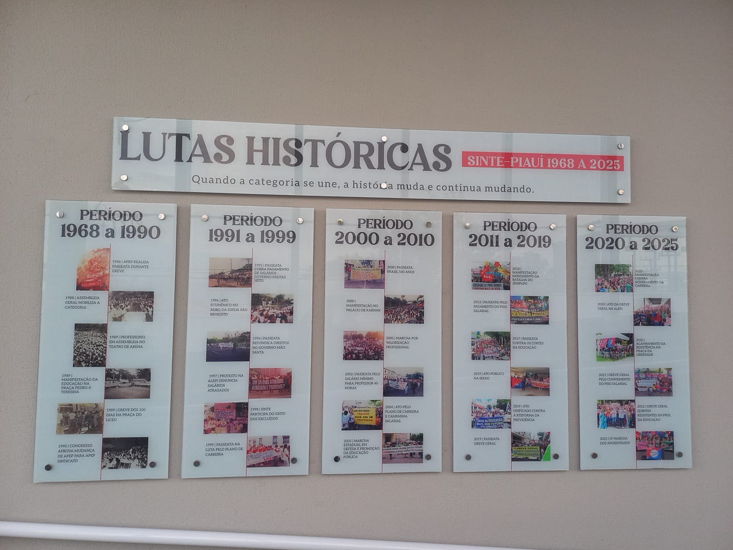 Instalado na sede do sindicato, o painel reúne momentos emblemáticos da história do SINTE-PI: mobilizações, assembleias, marchas, greves, negociações e atos públicos que marcaram a defesa da educação pública, da valorização profissional e dos direitos da categoria. Cada fotografia carrega a memória de homens e mulheres que fizeram — e seguem fazendo — a história do sindicato.