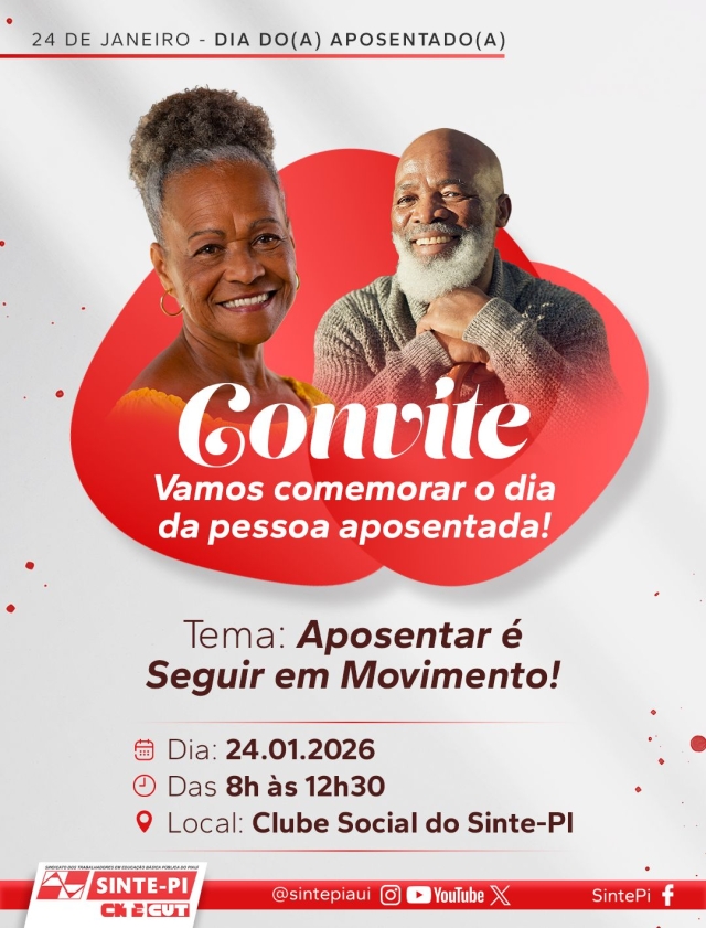 Com o tema “Aposentar é seguir em movimento!”, a atividade será realizada no dia 24 de janeiro de 2026, das 8h às 12h30, no Clube Social do Sinte-PI, reunindo homenagens, mensagens político-sindicais e momentos de integração, reafirmando o compromisso do sindicato com quem dedicou sua vida à educação pública.