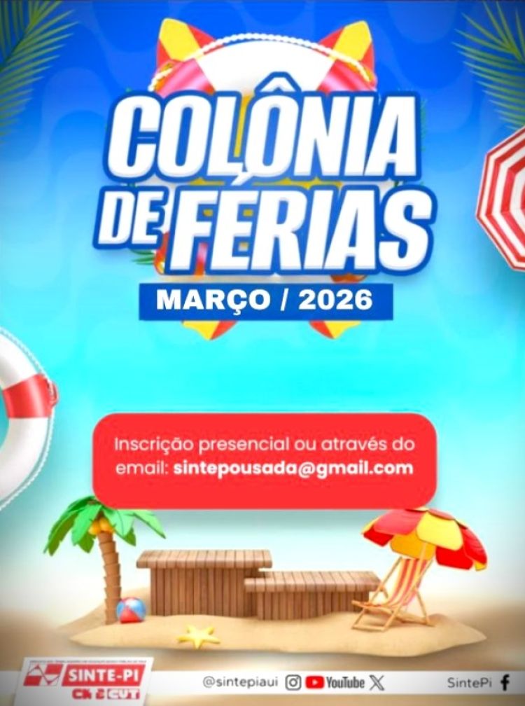 As inscrições para o Mês de MARÇO/2026 na Colônia de Férias estão abertas e devem ser realizadas presencialmente no escritório do SINTE-PI, dos Núcleos Regionais ou através do e-mail(sintepousada@gmail.com), no horário comercial (8h às 12h e das 14h às 17h30), de segunda a sexta-feira.