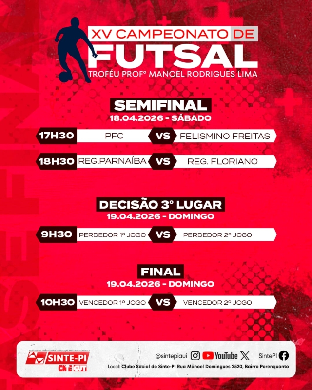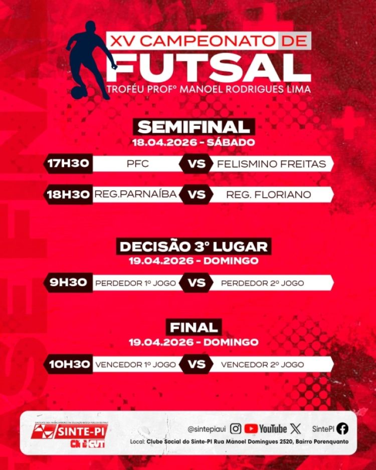 Neste sábado (18), a bola rola no Clube do SINTE com a semifinal do XV Campeonato de Futsal do SINTE-PI, na disputa do Troféu Professor Manoel Rodrigues. A partir das 17h30, o duelo eletrizante entre as equipes do PFC e Felismino Freitas promete abrir a noite com muita garra e talento. Logo depois, a partir das 18h30, será a vez de outro clássico imperdível com os times do Núcleo Regional de Parnaíba e do Núcleo Regional de Floriano, também buscando uma vaga na grande decisão.