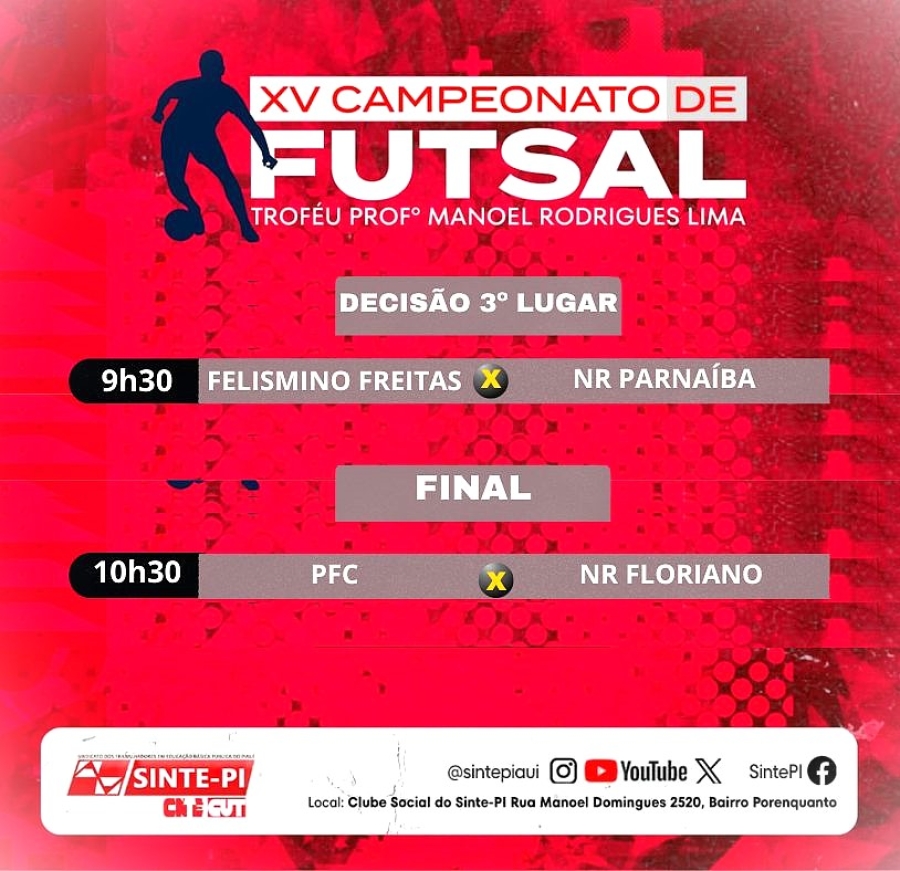 Neste domingo, a quadra do Clube do SINTE será novamente palco de mobilização e celebração coletiva. Às 9h30, Felismino Freitas e NR Parnaíba disputam o 3º lugar. Logo depois, às 10h30, acontece a finalíssima entre PFC e NR Floriano, que decidirá o campeão do Troféu Professor Manoel Rodrigues. A premiação contemplará não apenas os quatro primeiros colocados, mas também o artilheiro e o melhor goleiro, reconhecendo o talento e o esforço de cada participante.