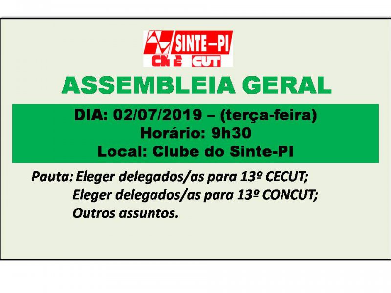 A assembleia irá eleger os delegados e delegadas para participar do 13º Congresso Nacional da CUT (CONCUT), que acontecerá de 07 a 10 de outubro, em São Paulo e os delegados e delegadas para o 13º Congresso Estadual na CUT-PI (CECUT-PI), que acontecerá dias 29 e 30 de novembro de 2019, em Teresina-PI.