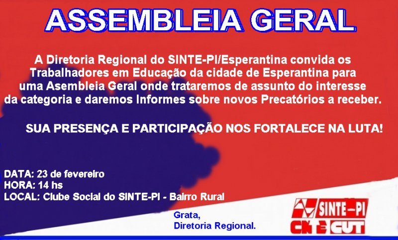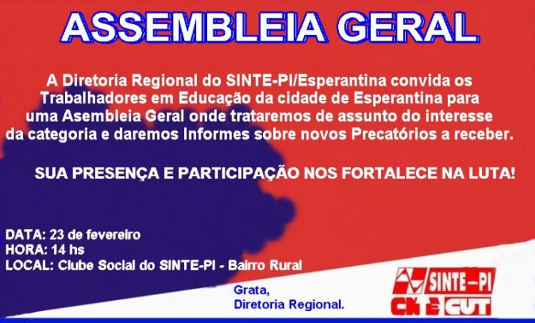No próximo sábado (23), o Núcleo de Esperantina do Sinte-PI realizará uma Assembleia Geral dos/as Trabalhadores/as em Educação Básica Pública, a partir das 14h, no Clube Social do Sinte-PI, localizado na zona Rural do município.