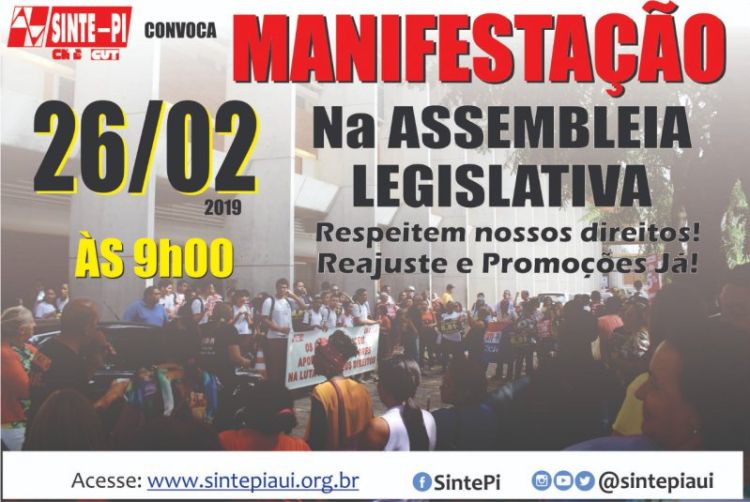 Nesta terça-feira (26), o Sindicato dos Trabalhadores em Educação Básica do Piauí (SINTE-PI) realizará uma manifestação a partir das 9 horas no pátio da Assembleia Legislativa do Piauí (ALEPI) para pressionar os deputados a votarem contra o projeto de mensagem nº 06 enviado pelo Governo do Estado a ALEPI que sacrifica os servidores públicos em prol do crescimento da economia no Piauí. Os ajustes encontrados no documento se moldam em caráter autoritário e antidemocrático, o mesmo, suspende as promoções e veda o reajuste de todos os servidores, inclusive os profissionais da educação.