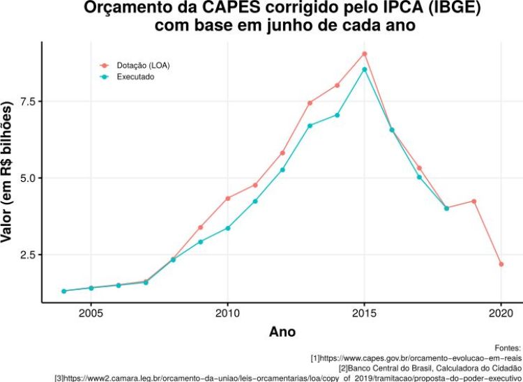 Evolução do orçamento da CAPES desde 2004 até 2020, com base no valor estabelecido na Lei Orçamentária Anual (LOA) e valor de fato executado (i.e., o que foi gasto de fato) em cada ano, atualizado pelo IPCA (IBGE) utilizando o mês de junho de cada ano como base de cálculo da atualização. Por estarmos em 09/2019, os anos de 2019 e 2020 apresentam apenas aquilo que foi autorizado na LOA.