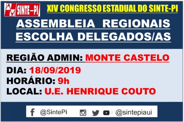 Nesta quarta-feira (17/09), às 9h, os dirigentes do Sinte-PI reunirá os servidores da educação que compõem as escolas da região administrativa do Monte Castelo para eleger os/as delegados/as que participarão do Congresso Estadual do Sinte-PI em janeiro de 2020.