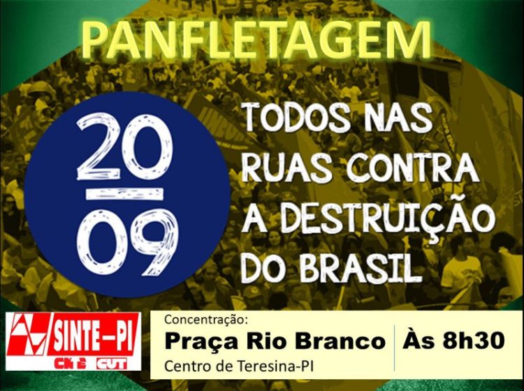 A exemplo dos Atos que acontecerão nacionalmente denunciando a destruição do Brasil por parte do governo federal, no movimento organizado pela CNTE, CUT e demais centrais sindicais, o SINTE-PI irá realizar uma panfletagem na manhã desta sexta-feira (20/09), às 8h30 na Praça Rio Branco, centro de Teresina.