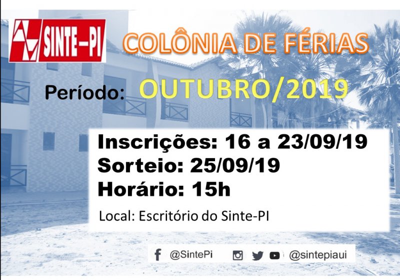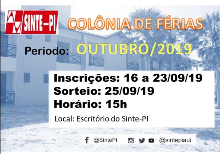 Estão abertas as inscrições para a colônia de férias do Sinte-PI para o período de outubro/2019. As inscrições tiveram início dia 16 e prosseguem até dia 23/09, no escritório do Sinte-PI em Teresina ou em um Núcleo Regional mais próximo de você.