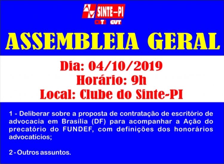 A presidente do Sinte-PI, professora Paulina Almeida, no uso de suas atribuições legais, convoca todos/as os/as trabalhadores em educação sócios/as deste sindicato para uma ASSEMBLEIA GERAL EXTRAORDINÁRIA dia 04 de outubro, às 9h para tratar da seguinte pauta: