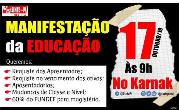 O Sinte-PI convoca todos os/as trabalhadores/as em educação básica pública, para participar de forma ativa da manifestação, decidida na Assembleia Geral realizada na última sexta-feira (4).