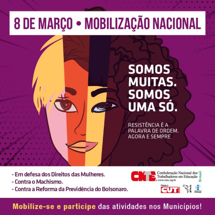 No próximo 8 de Março, a Confederação Nacional dos Trabalhadores em Educação (CNTE), convida todos os profissionais em educação a participarem da Mobilização Nacional em Defesa da Mulher, contra o machismo e a Reforma da Previdência do Bolsonaro.