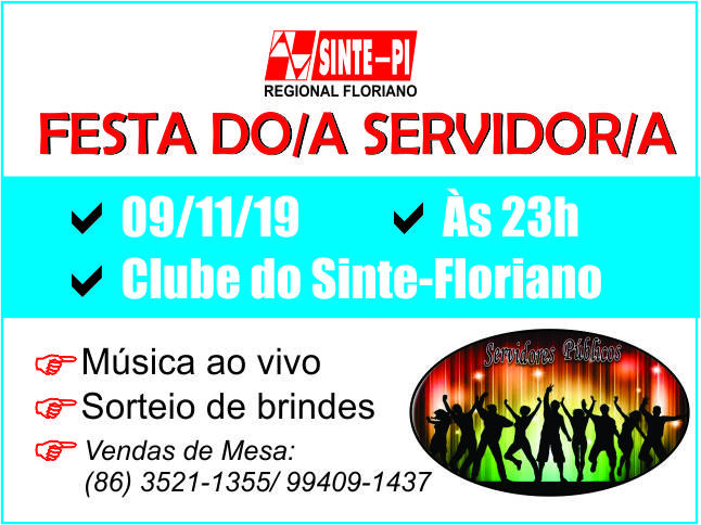 O Sinte Núcleo Regional de Floriano realizará no próximo sábado (09) uma confraternização em homanegem aos trabalhadores em educação da região pela passagem do Dia do/a Servidor/a.