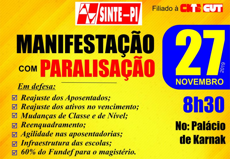O Sinte-PI convoca todos os trabalhadores em educação para uma manifestação com paralisação dia 27 de novembro, a partir das 8h30, em frente ao Palácio de Karnak. em defesa do paridade e pela valorização profissional.