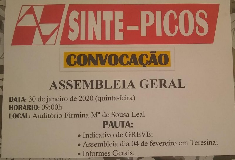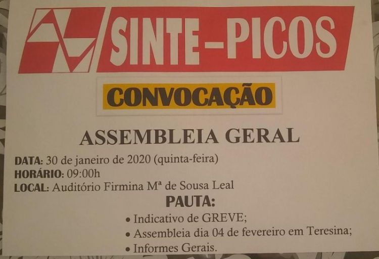 O Núcleo Regional de Picos convoca todos os trabalhadores em educação a rede estadual para uma assembleia geral extraordinária para discutir o reajuste 2020.